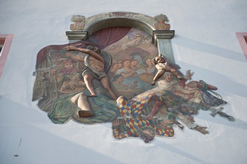 1737 soll die Theatertruppe der Caroline Neuber in Leipzig den Harlekin symbolisch von der Bühne verbannt haben. Beim Umbau der früheren Jesuitenschule zum Theater wurde diese Episode deutscher Theatergeschichte auf einem farbigen Relief an der Fassade dargestellt (urspr. 1790, 1934 rekonstr.). Man sieht, wie die verschiedenen Spaßmacher von der Bühne gedrängt werden, mitten im Geschehen die Neuberin, im Hintergrund das Dichterpferd Pegasus. Der Maler Franz Xaver Herrmann (1758‒1839) war der Sohn des bekannteren Kirchenmalers Franz Ludwig Herrmann und Onkel der Konstanzer Malerin Marie Ellenrieder.